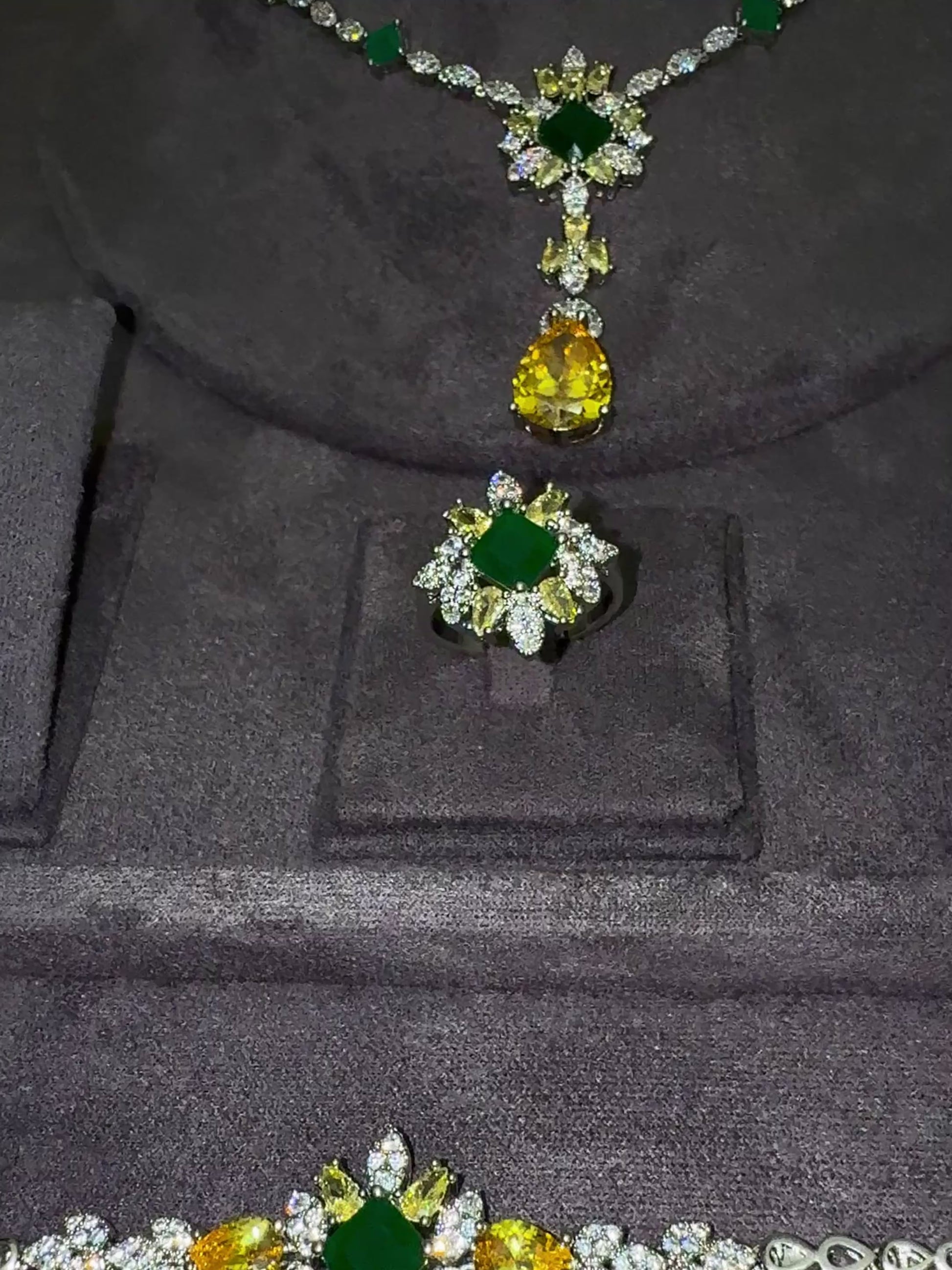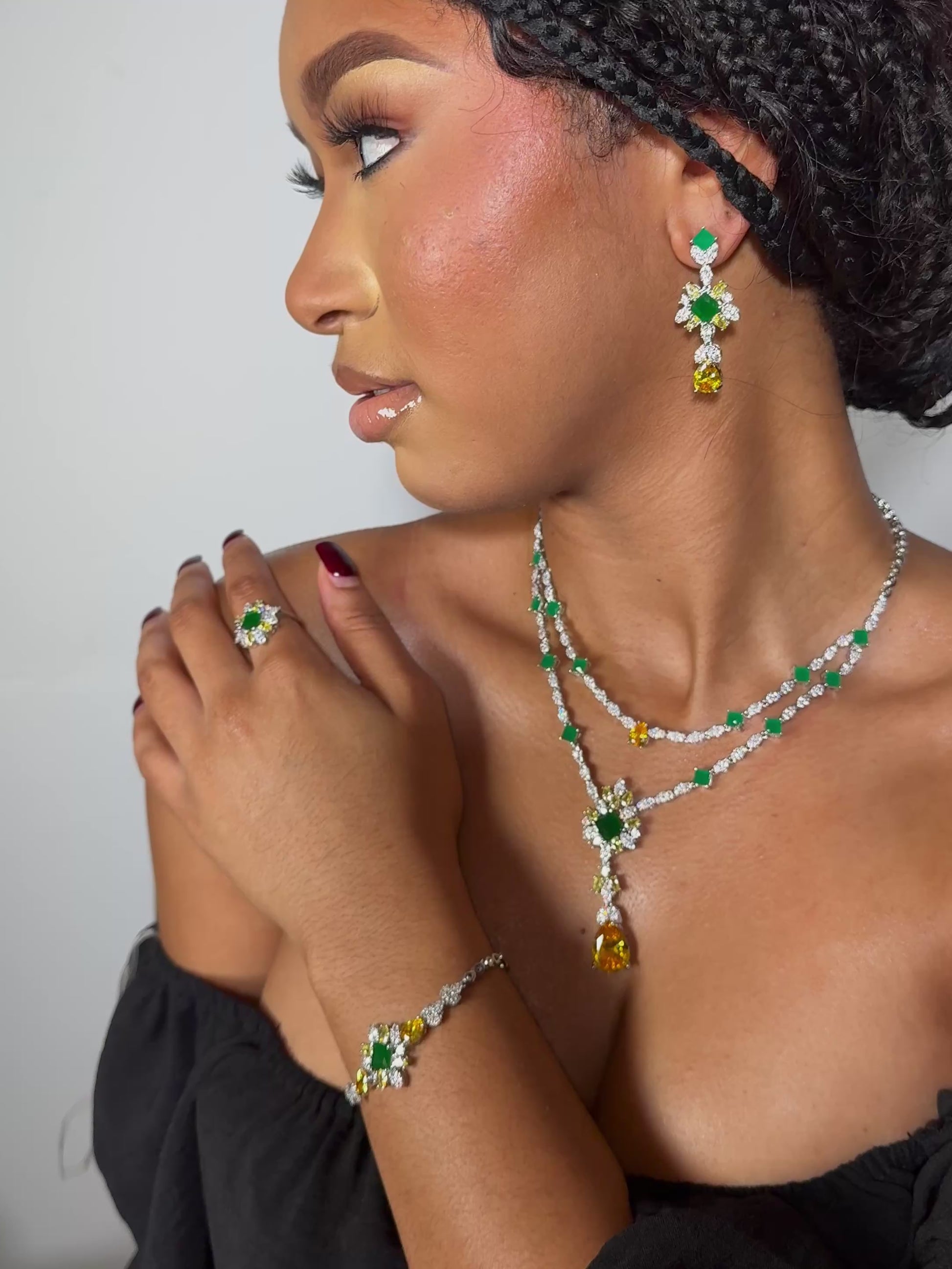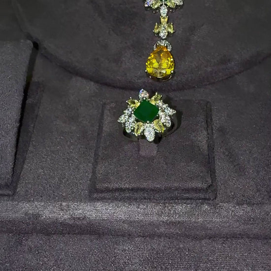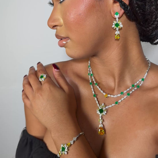 Add color , sparkle and all round elegance with The Adela 4 pcs set This luxurious 4-piece set includes a glittering necklace, earrings, bracelet, and ring, adding elegance and colorful sparkle to any outfit. The cascading design of the neck piece is sure to make you stand out with style. Upgrade your look with Adela CZ set