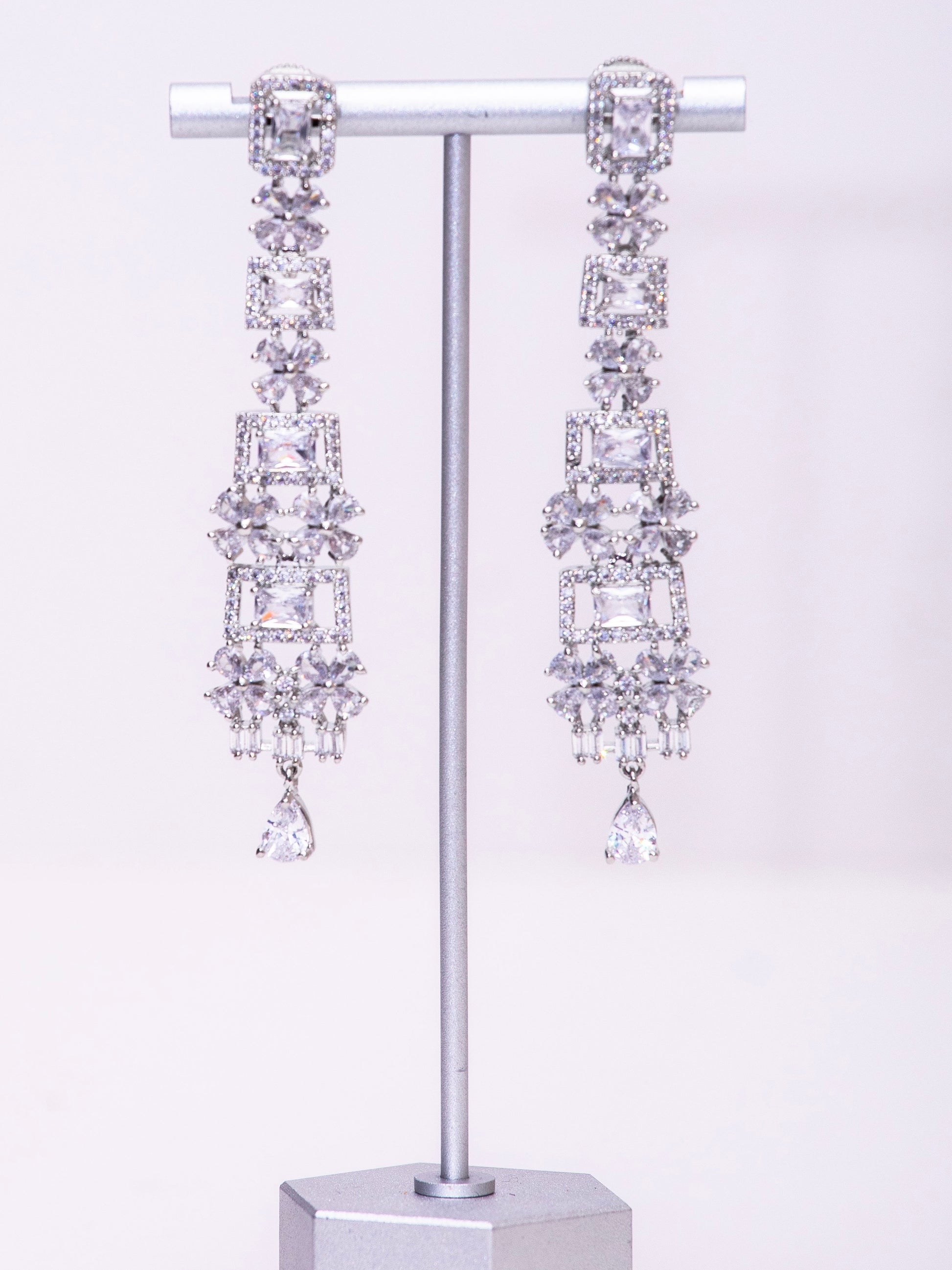 Our Amari CZ Earrings are handcrafted with Indian beauty and precision. Featuring a long, silver tone design, these earrings provide a classic, timeless look. Inspired by classic Indian jewelry craftsmanship, these earrings are perfect for any occasion