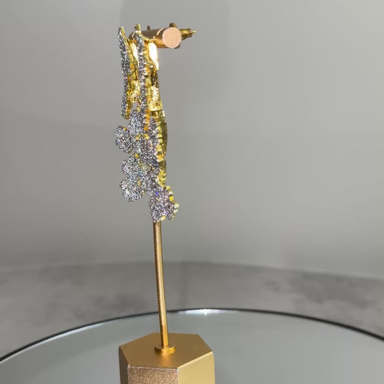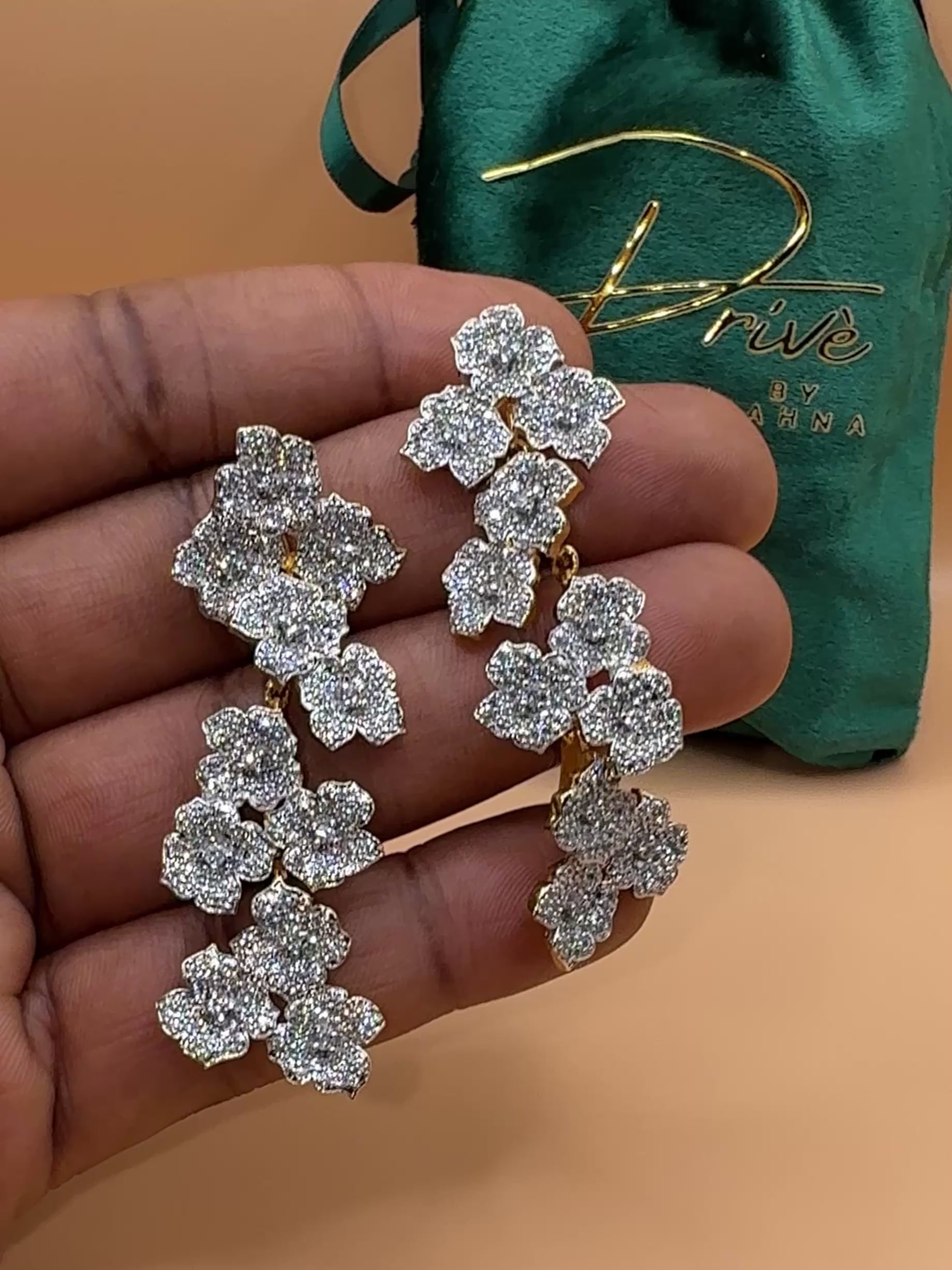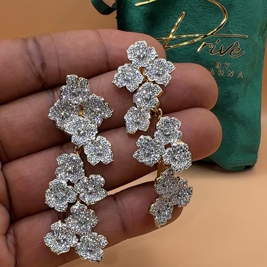 Bring refined elegance to your look with the EESHA Indian CZ Earrings, a beautifully understated yet luxurious piece inspired by soft floral silhouettes. Handcrafted in India by skilled artisans, these earrings feature a cascade of petite flower clusters, each encrusted with premium cubic zirconia stones that shimmer delicately with every movement.