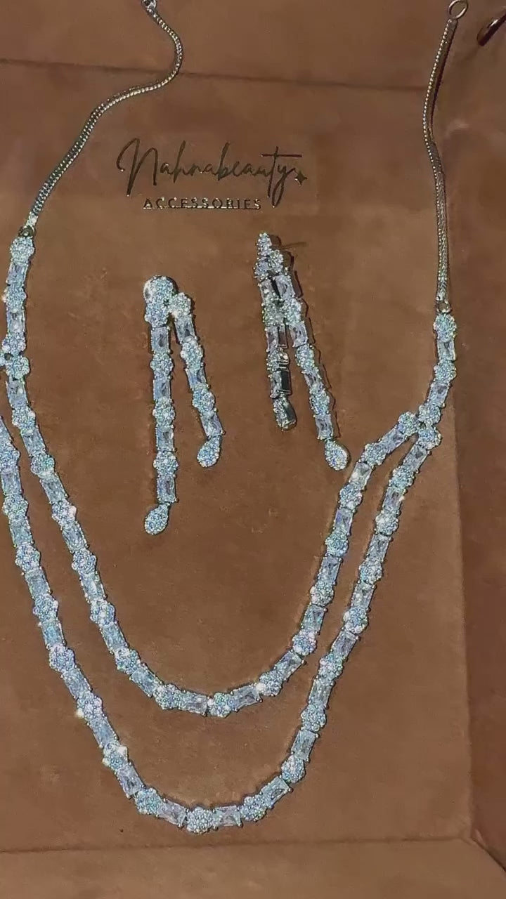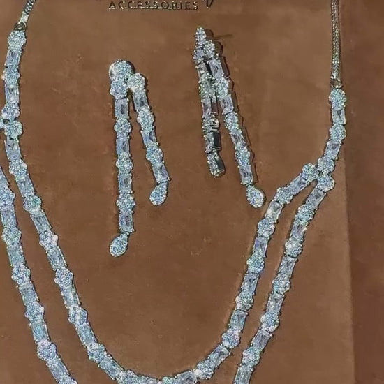 Elevate your look with the timeless brilliance of the NAVYA 2-Piece CZ Jewelry Set, a sophisticated pairing of a double-layer CZ necklace and matching cascading earrings. Designed for the modern woman who loves refined sparkle, this set features high-quality cubic zirconia stones that radiate with diamond-like luminosity.