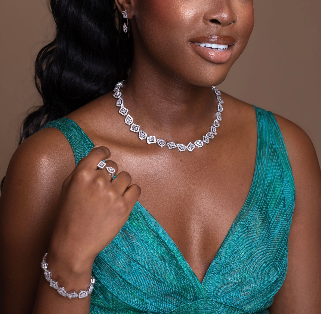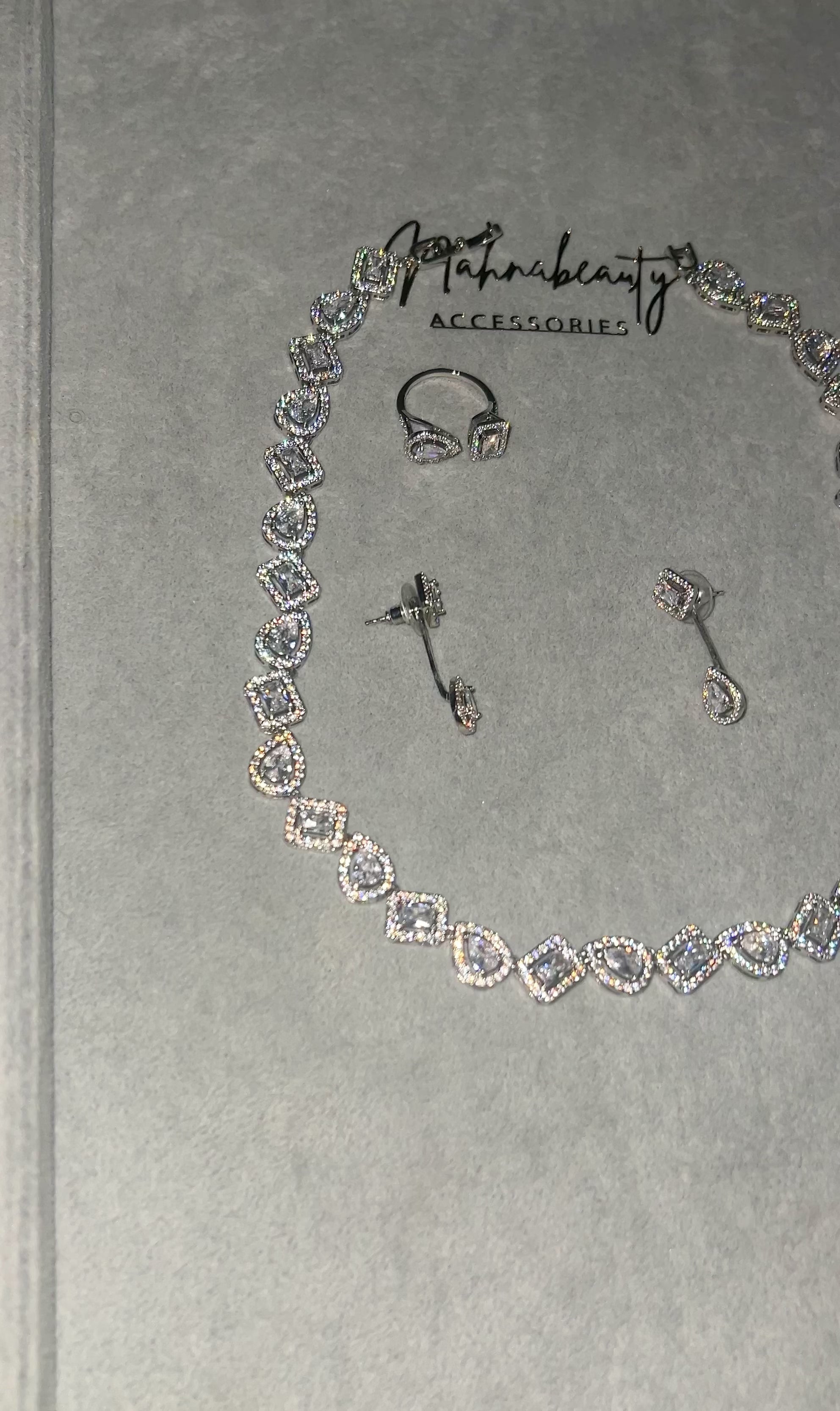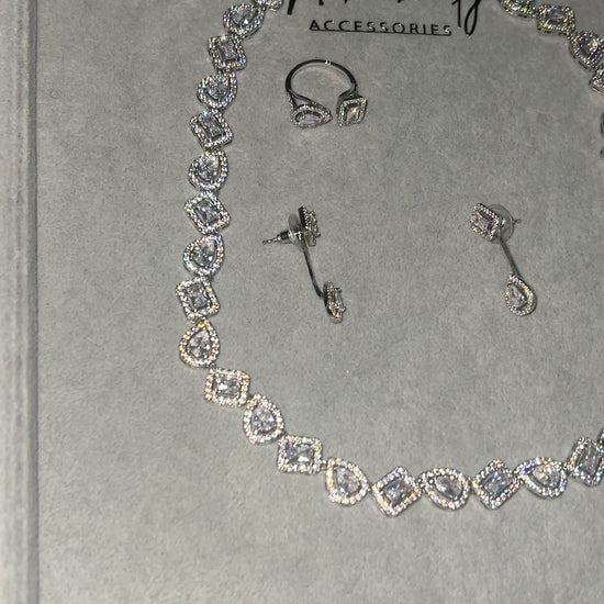 A complete AAA cubic zirconia jewelry set consisting of earrings, neckpiece, ring and bracelet . Perfect for Weddings, brides , special occasions , birthdays , anniversaries , celebrant .