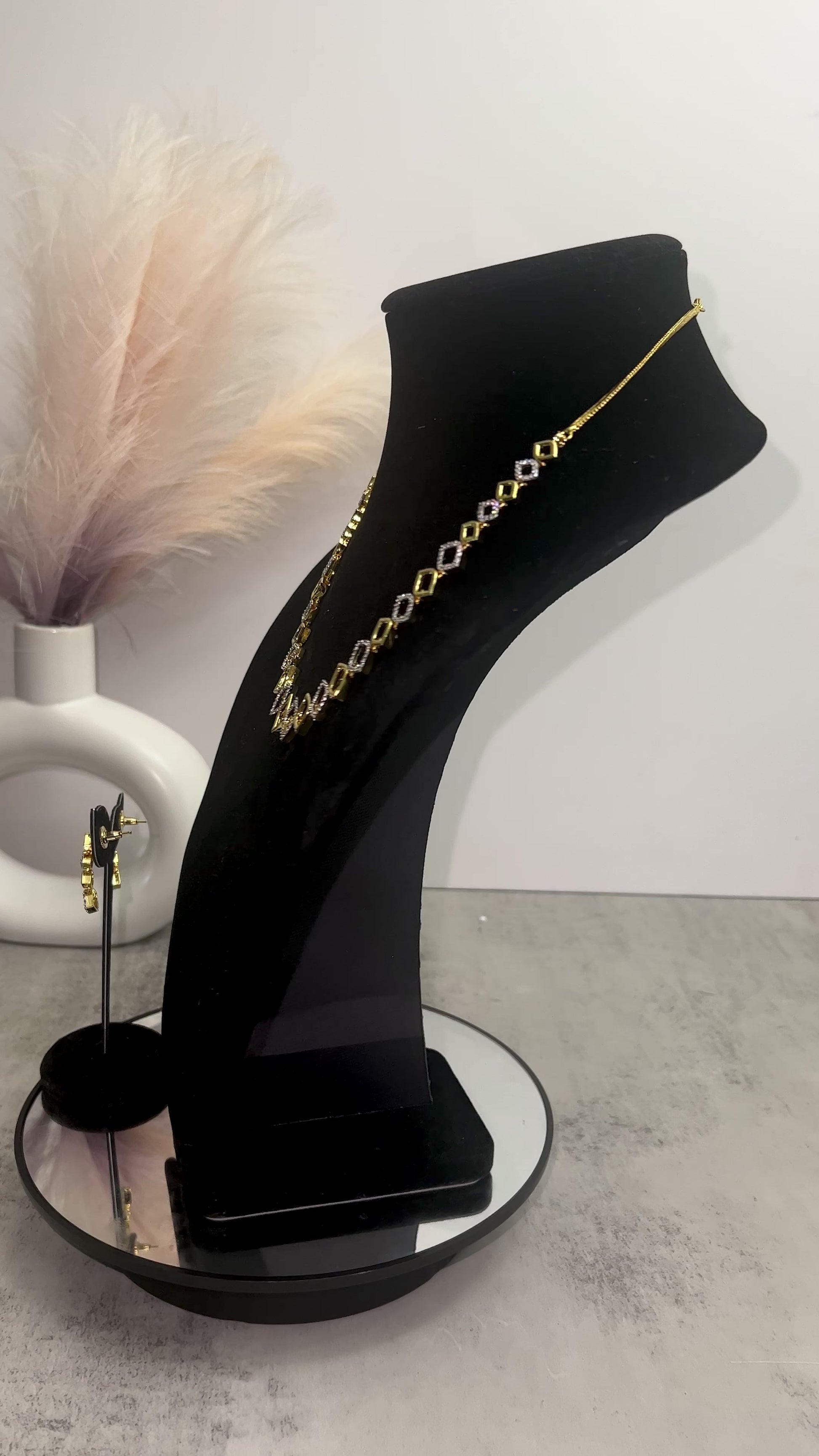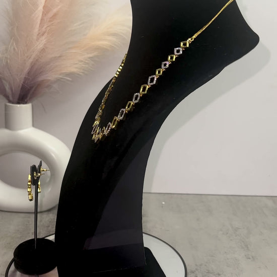 Enhance your style with the Nisha Indian necklace and earrings set. A masterpiece of minimalist elegance, this set features delicate spikes and sparkling accents. A perfect addition to any collection, it exudes a simple yet sophisticated charm that is sure to add a classic elegance to your look