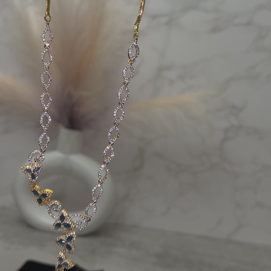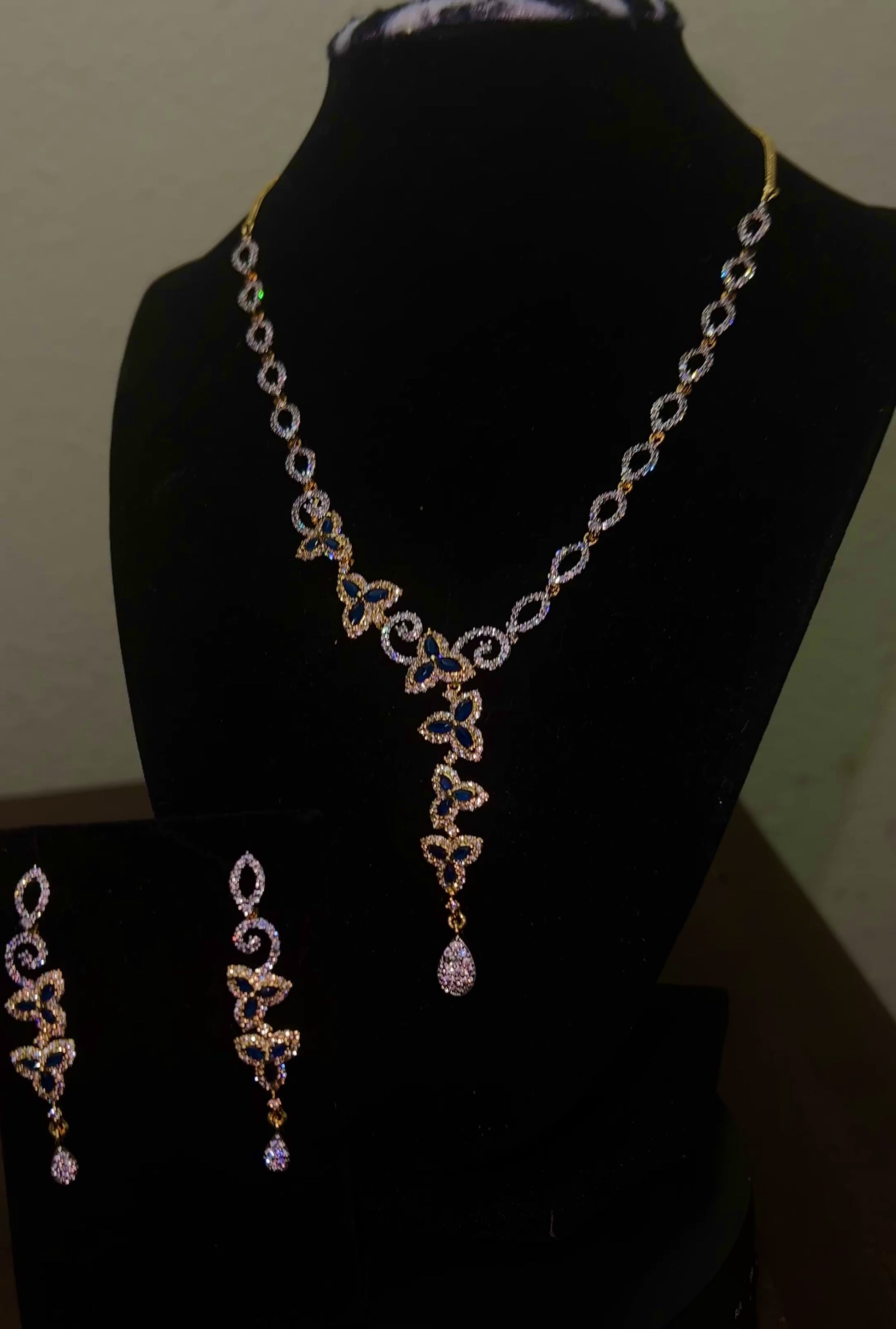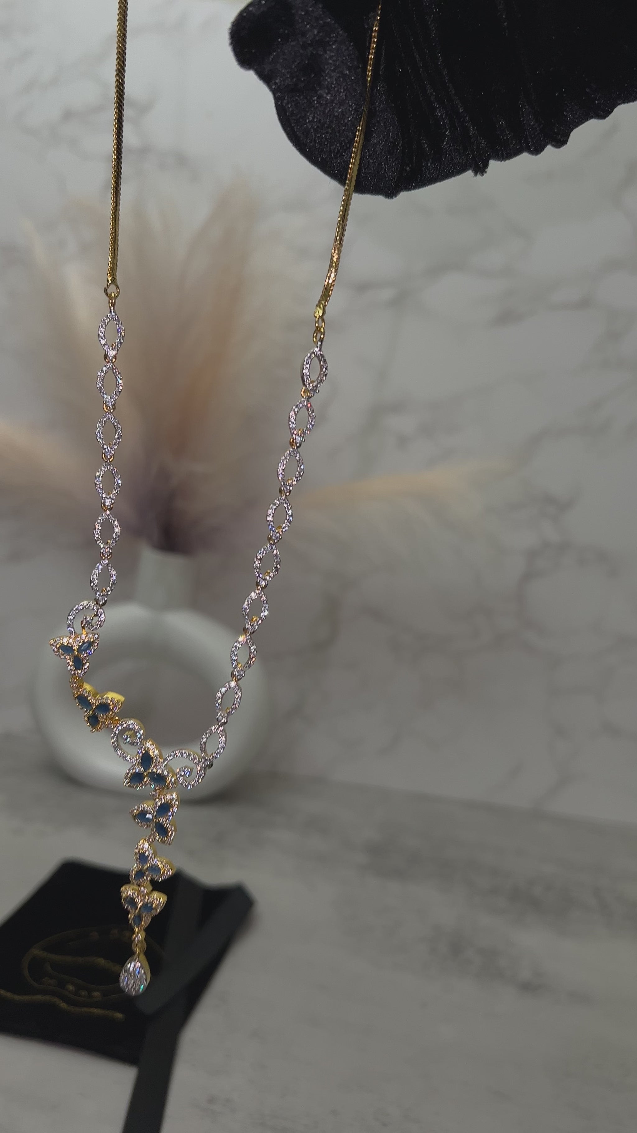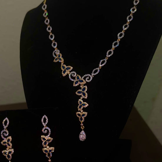 Adorn yourself in this exquisite 2-piece necklace and earrings set, crafted to deliver a captivating presence with its regal colors and delicate design. An excellent option for brides and special occasions. 24 karat gold plated and made with premium AAA CZ stones