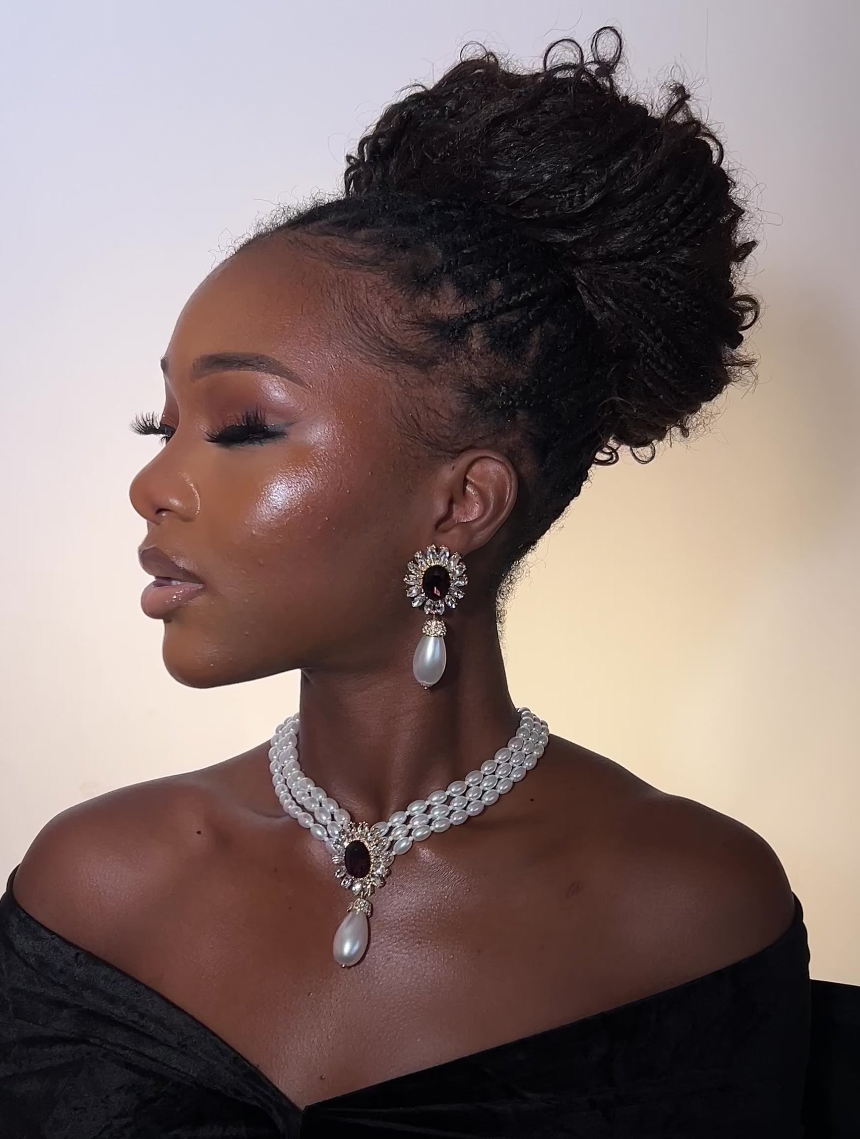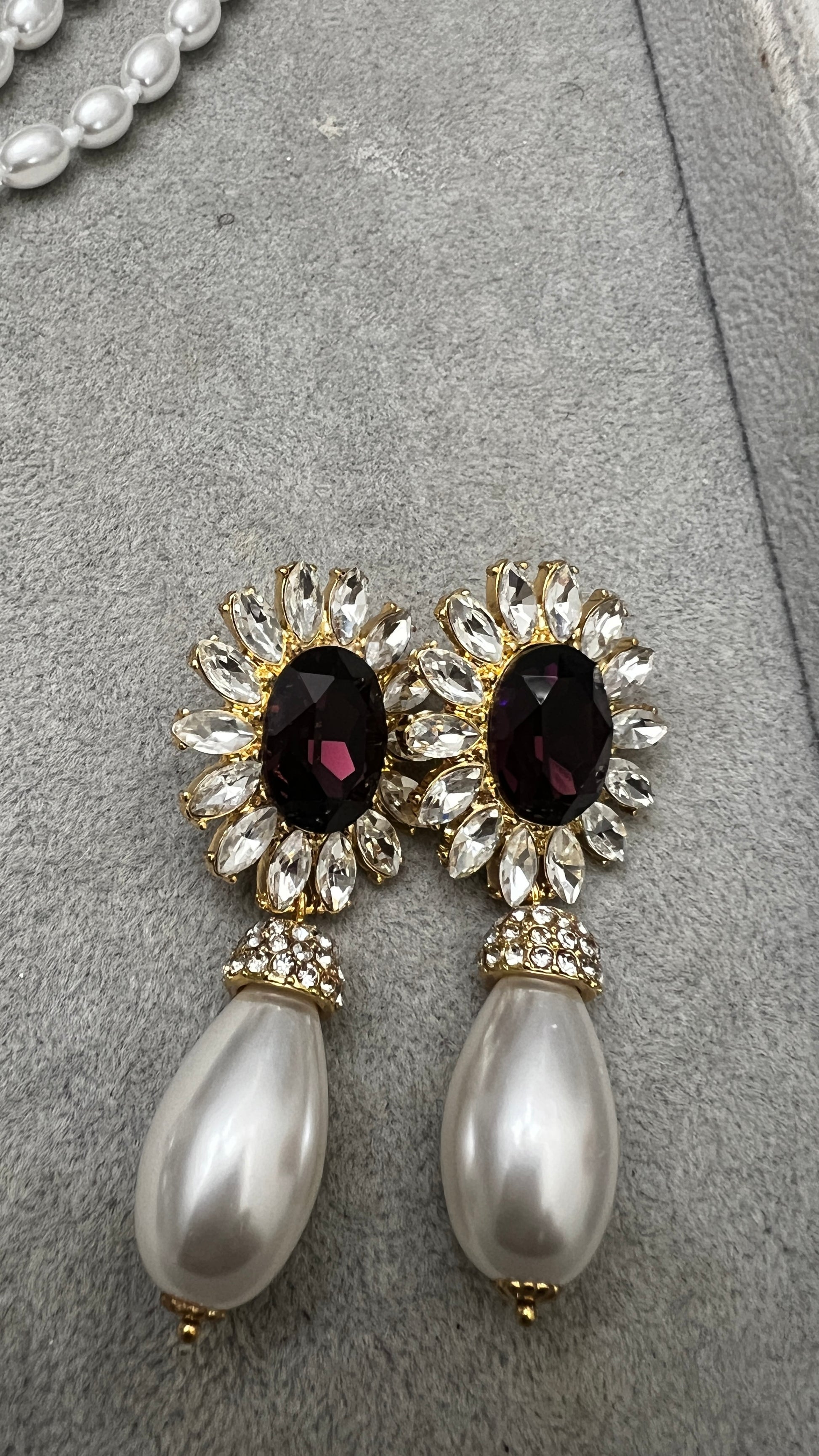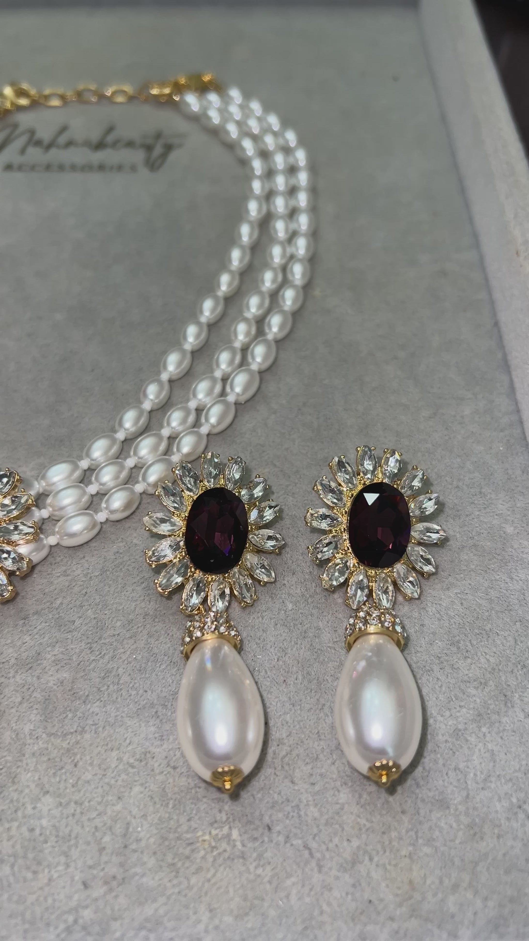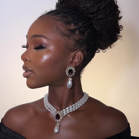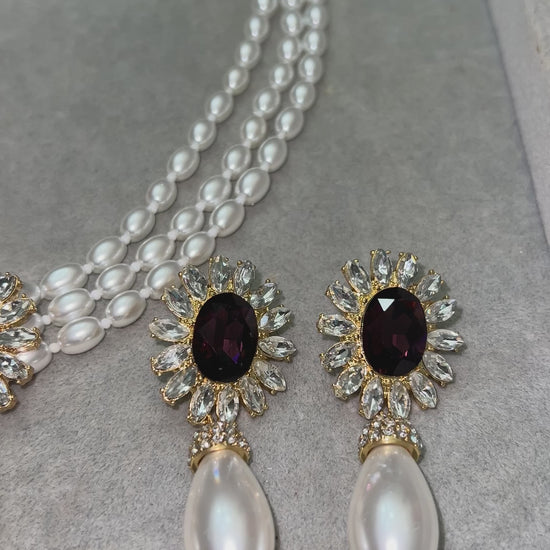 Revel in luxury with the Romina Pearl Set, a regal collection of earrings and necklace adorned with bold, exquisite pearls and a deep purple gemstone. Elevate your wardrobe with this timeless and opulent set fit for a queen.