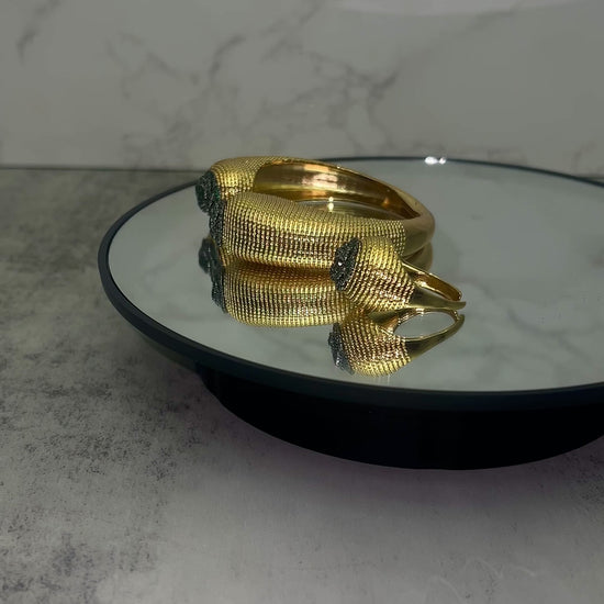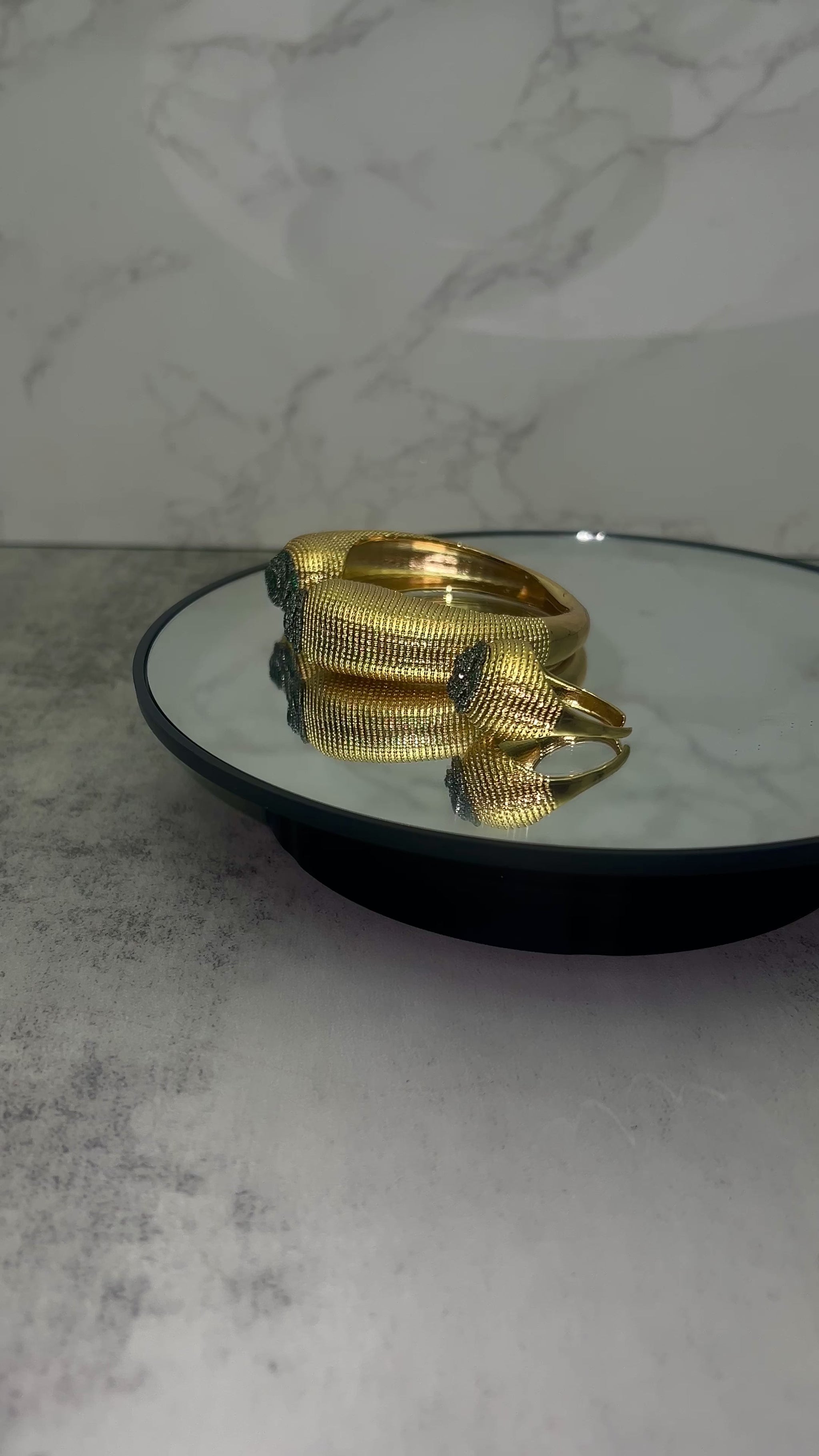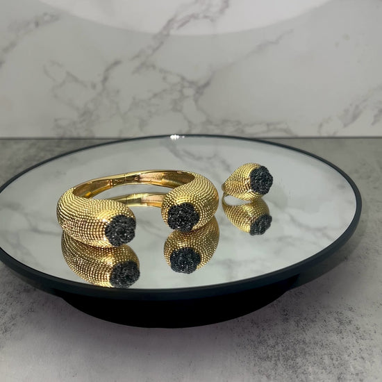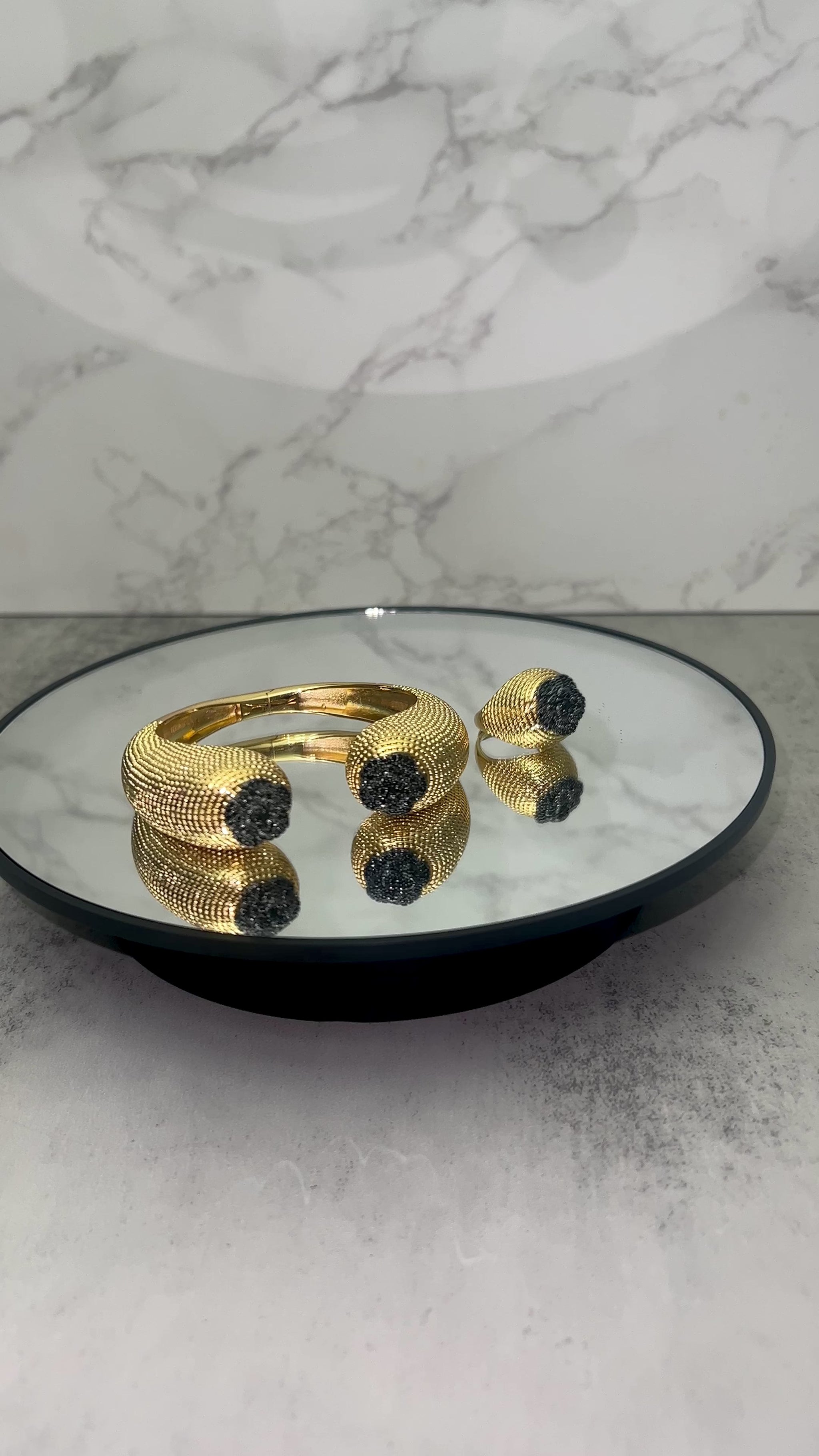 The Alba two pcs set features a non-tarnish stainless steel ring and bangle. Its bold design is accented with studded rose accents for a luxurious and sophisticated look. Perfect for making any outfit special.
