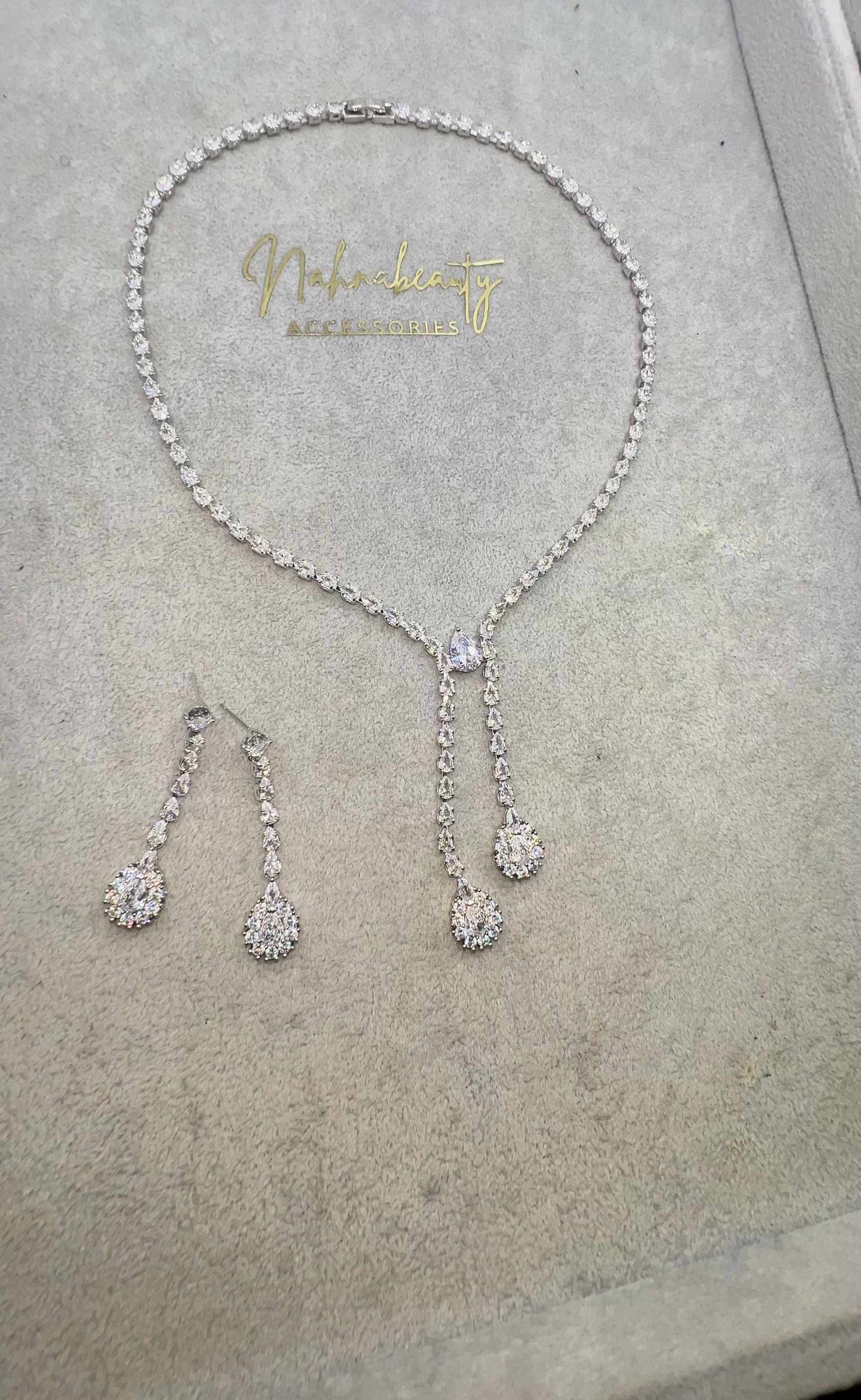 Discover the elegant Amika two-piece jewelry set. Designed for brides, this set includes a stunning necklace and dainty earrings. Beautifully crafted, this set will elevate any brides outfit and style .