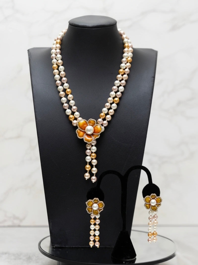At the heart of the necklace sits a delicately crafted floral centerpiece, highlighted with CZ accents and finished with cascading pearl drops that elongate the neckline. The coordinating earrings mirror the same floral motif, creating a perfectly balanced, polished look ideal for weddings, celebrations, and elevated occasions.
