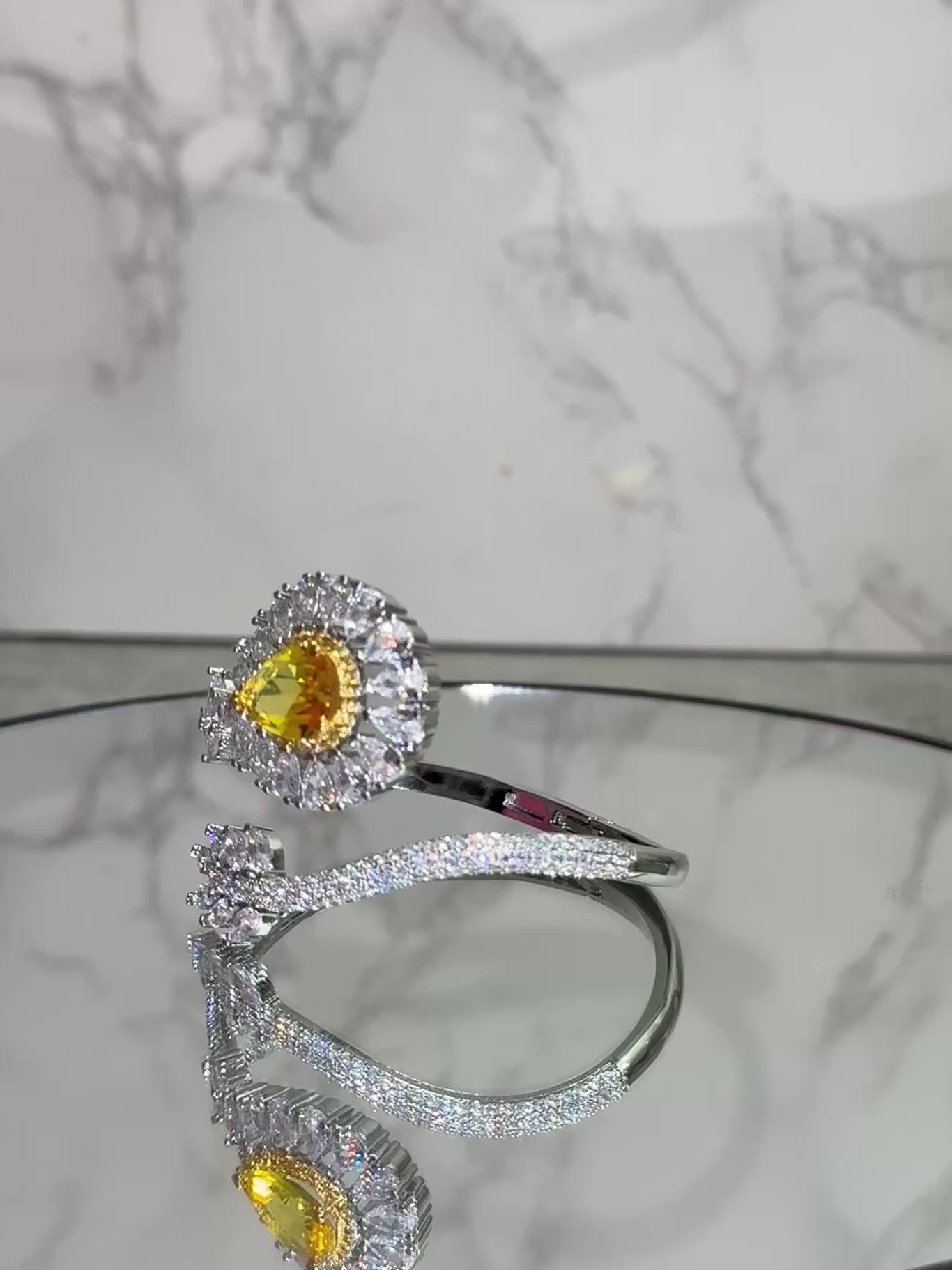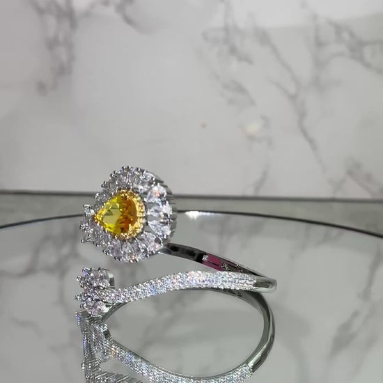 This stunning CZ bracelet features a captivating design that combines elegance and sparkle. The centerpiece is a striking pear-shaped yellow cubic zirconia stone, surrounded by a halo of brilliant white CZ stones that enhance its radiance. The sleek, polished band is adorned with delicate leaf motifs, adding a touch of nature-inspired charm. Perfect for special occasions or everyday wear, this bracelet will elevate any outfit with its luxurious appeal and shimmering details. A timeless piece that embodies sophistication and style.