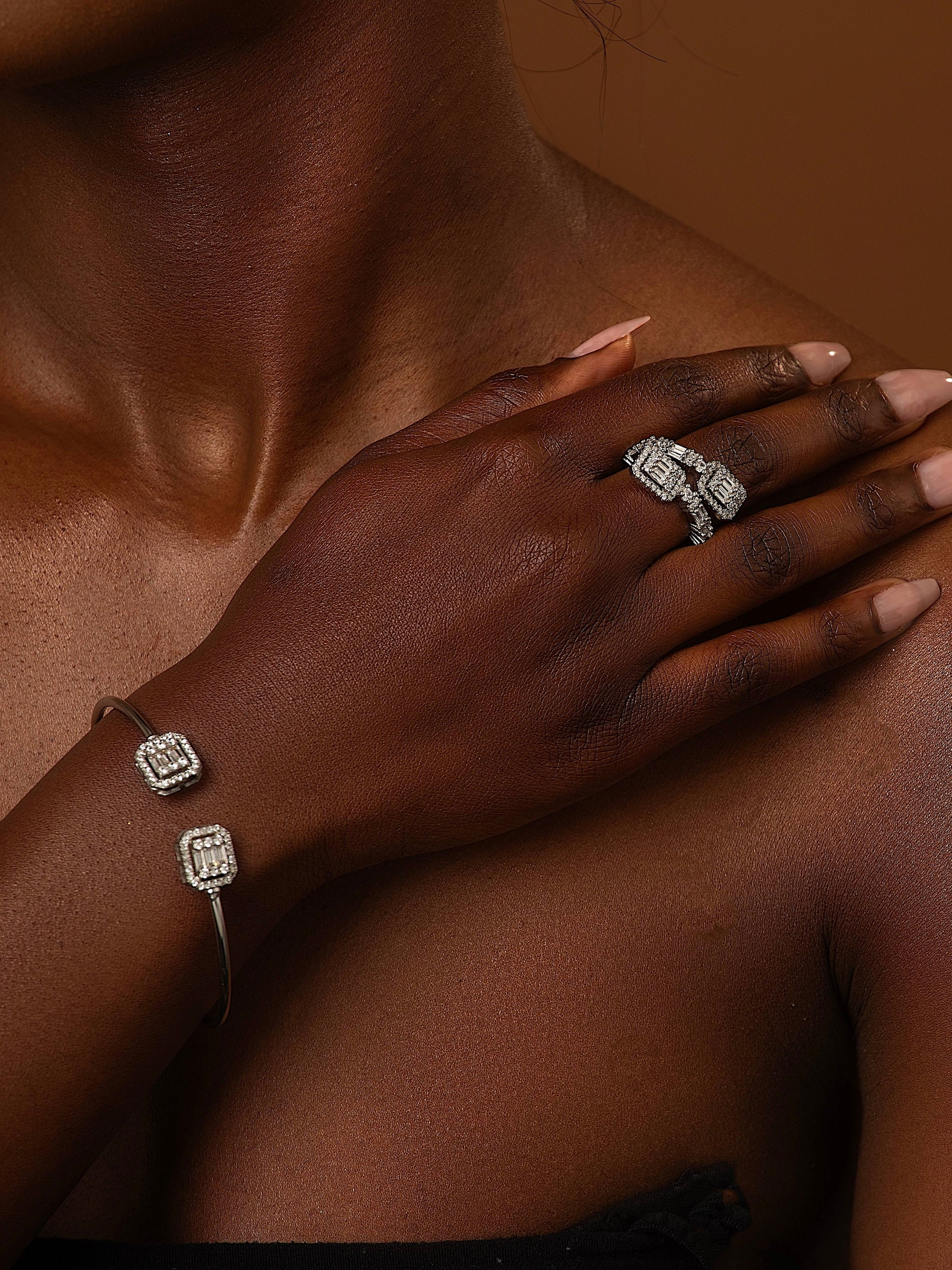 This exquisite Ziba three-piece set is perfect for creating an elegant and tasteful look. Crafted from high-quality materials, the set features a stunning ring, cuff bracelet, and earring, that blend together for a sophisticated and exclusive aesthetic. Whether for special occasions or everyday wear, this set is sure to make a statement. Comes as a two set as well as a three pcs set