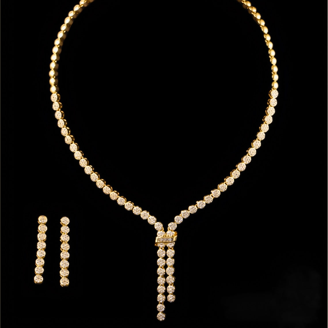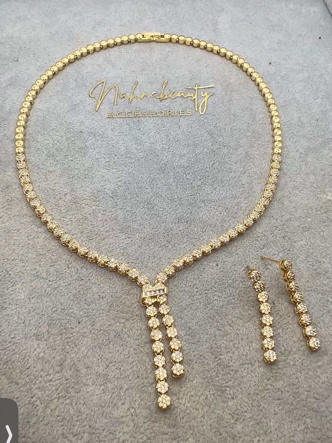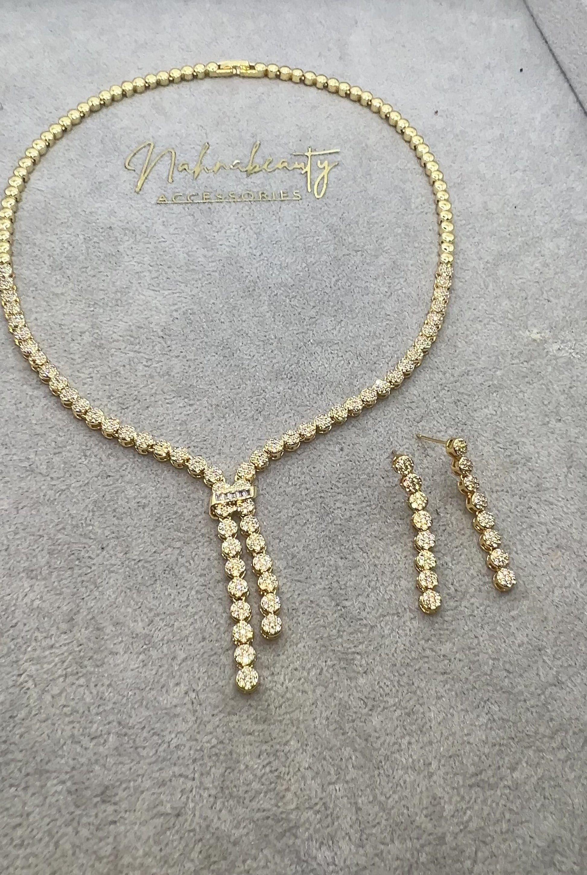 Bejewelled in shimmering CZ zirconia, the Ziva 2 pcs set exudes ultimate class and elegance. This exquisite set, which comprises of a matching necklace and earring duo, is crafted in an opulent gold tone for an exquisite look. Indulge in timeless luxury for that special occasion.