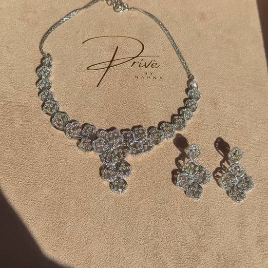 The necklace showcases an ornate floral-inspired centerpiece that gracefully cascades along the neckline, creating a bold yet refined silhouette. Paired with coordinating drop earrings, the ZIYA set exudes sophistication, making it the perfect choice for weddings, formal occasions, bridal events, and elevated evening looks.